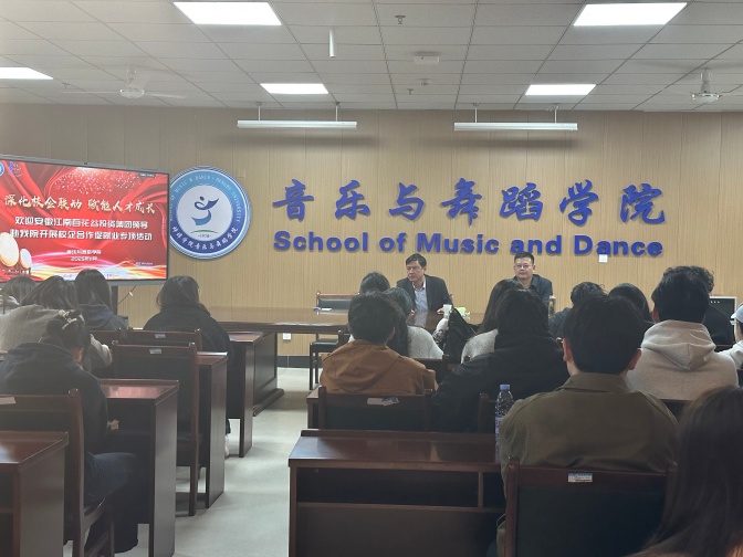 俞勇对学院的热情接待表示感谢,他结合企业发展实践,全面解读了安徽江南百花谷投资集团的发展战略与资源优势。作为深耕蚌埠文旅产业十余载的龙头企业,集团打造了占地千余亩的特色文旅项目,其中凤凰山演艺中心大舞台已成为皖北文旅行业的标志性平台,近期更成功举办多场大型演艺活动,为区域文化产业注入强劲活力。俞勇指出,企业的持续发展离不开高素质专业人才的支撑,音乐与舞蹈学院的人才培养方向与集团“文旅+”发展战略高度契合,希望借助高校的智力优势与人才储备,在演艺项目策划、非遗文化活化、艺术人才输送等方面开展深度合作,构建“高校赋能企业、企业反哺教育”的双赢格局。